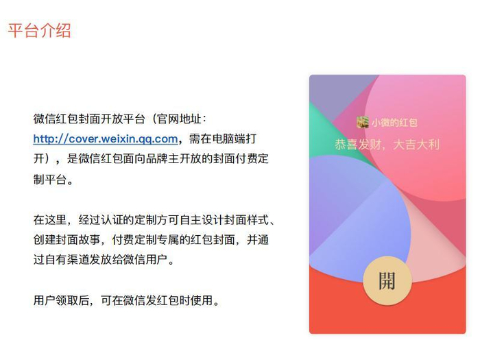 据介绍,微信红包封面开放平台是微信红包面向品牌主开放的封面付费定制平台。在这里,经过认证的定制方可自主设计封面样式、创建封面故事,付费定制专属的红包封面,并通过自有渠道发放给微信用户。用户领取后,可在微信发红包时使用。