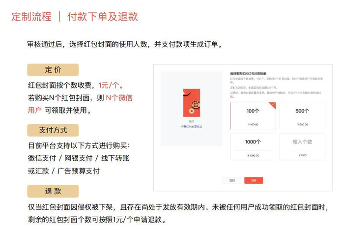 可定制区域包括拆红包、红包消息气泡、红包详情、发红包、封面故事,红包封面按个数收费,1元/个,若购买N个红包封面,则N个微信用户可领取并使用红包封面。