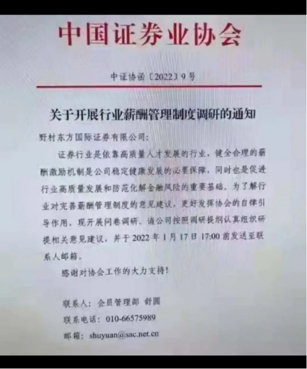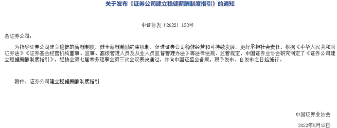 今年年初,中国证券业协会曾向券商下发薪酬管理制度调研的通知,要求券商在1月17日17点前提交反馈意见。其中提到,健全合理的薪酬激励机制是公司稳定健康发展的必要保障,同时也是促进行业高质量发展和防范化解金融风险的重要基础。