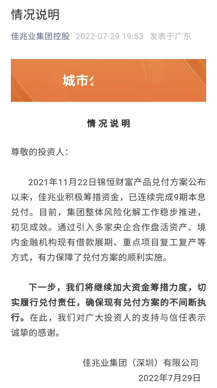 7月29日晚,佳兆业集团控股官方微信公众号发布消息称,2021年11月22日锦恒财富产品兑付方案公布以来,佳兆业积极筹措资金,已连续完成9期本息兑付。目前,集团整体风险化解工作稳步推进,初见成效。通过引入多家央企合作盘活资产、境内金融机构现有借款展期、重点项目复工复产等方式,有力保障了兑付方案的顺利实施。