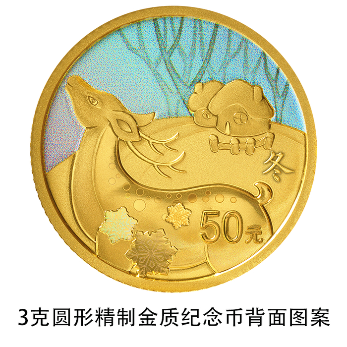 3克圆形金质纪念币背面图案为装饰鹿造型,衬以雪花、民居、树林等组合设计,并刊“冬”字样及面额。