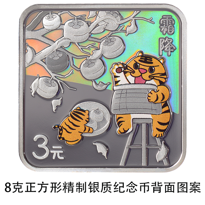 8克正方形银质纪念币背面图案以虎、柿树为主要设计元素,展现霜降时节采摘柿子情景,并刊“霜降”字样及面额。