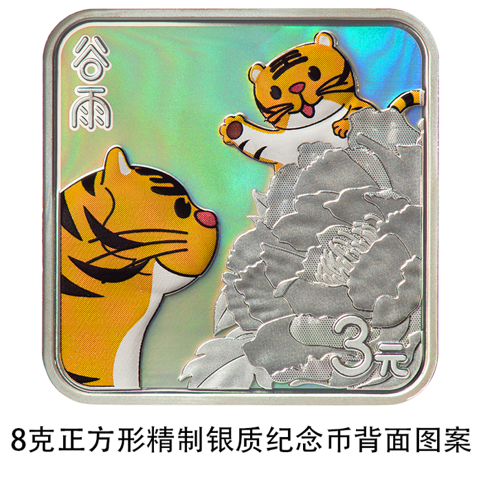 8克正方形银质纪念币背面图案以虎、牡丹为主要设计元素,展现谷雨时节“赏牡丹”习俗,并刊“谷雨”字样及面额。
