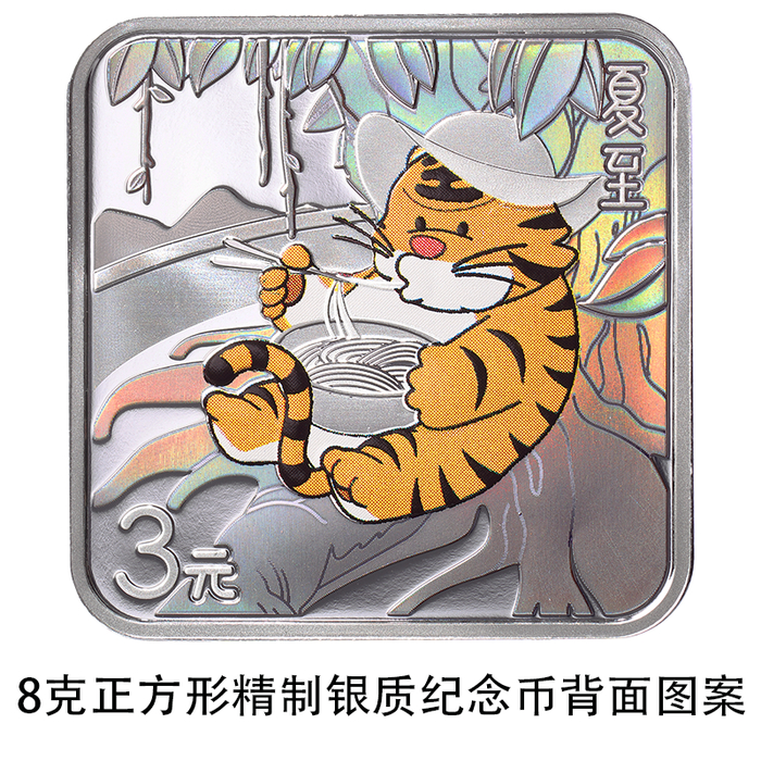 8克正方形银质纪念币背面图案以虎、榕树、面条为主要设计元素,展现夏至时节“夏至吃面”习俗,并刊“夏至”字样及面额。
