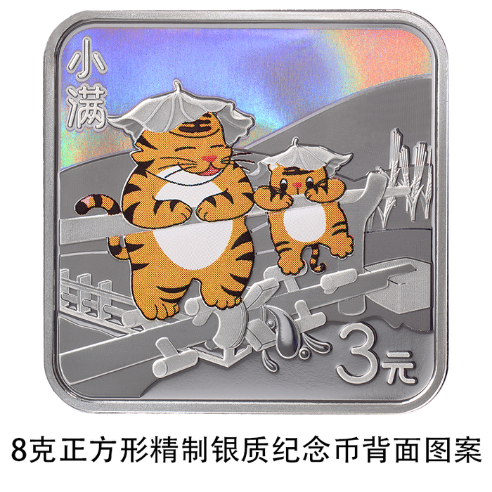 8克正方形银质纪念币背面图案以虎、水车、小麦为主要设计元素,展现小满时节物候、农事景象,并刊“小满”字样及面额。