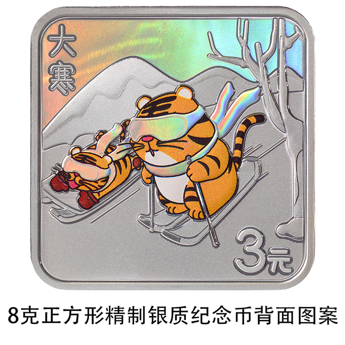 8克正方形银质纪念币背面图案以虎、雪具、雪山为主要设计元素,展现大寒时节滑雪嬉戏情景,并刊“大寒”字样及面额。