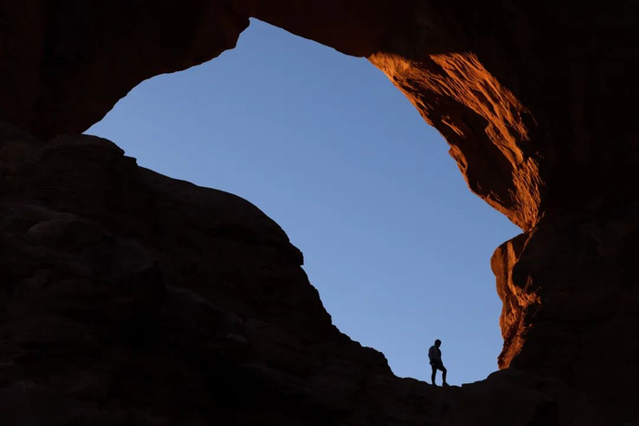 在拱门国家公园双拱形结构下的一位徒步旅行者。