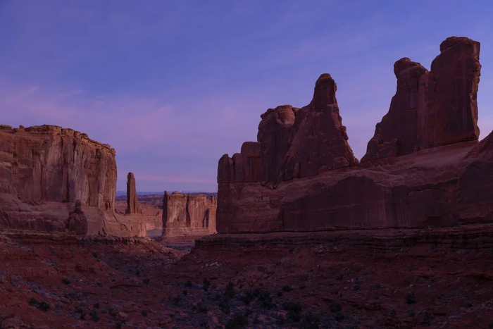 我们到达Panorama Point观景台时,砂岩的珊瑚和焦赭色在落日的余晖下显得更加鲜艳。Panorama Point观景台位于山上,视野开阔,非常适合观星。我们就着剩下的一些阳光,看到了拉萨尔山(La Sal Mountains)和火焰山迷宫(Fiery Furnace),那里靠近公园中心,有一系列狭窄的峡谷、鳍状岩石和天然拱门。