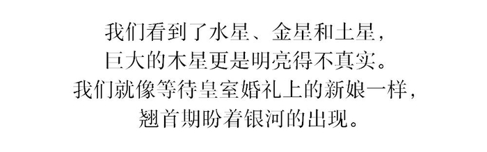当太阳落到地平线以下时,我的眼睛开始适应黄昏。我以前从没看过夜空的变化,它比我想象中更有趣。每当一颗行星进入视野,时不时就会有人轻声赞叹一句“哇”。我们看到了水星、金星和土星,巨大的木星更是明亮得不真实。我们就像等待皇室婚礼上的新娘一样,翘首期盼着银河的出现。