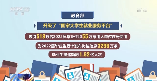 据了解,为广泛开拓市场工作岗位,教育部升级了“国家大学生就业服务平台”,吸引519万名2022届毕业生和55万家用人单位注册使用,为2022届毕业生累计发布岗位信息3296万条,毕业生投递简历1.92亿人次。