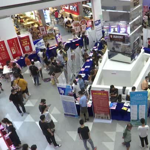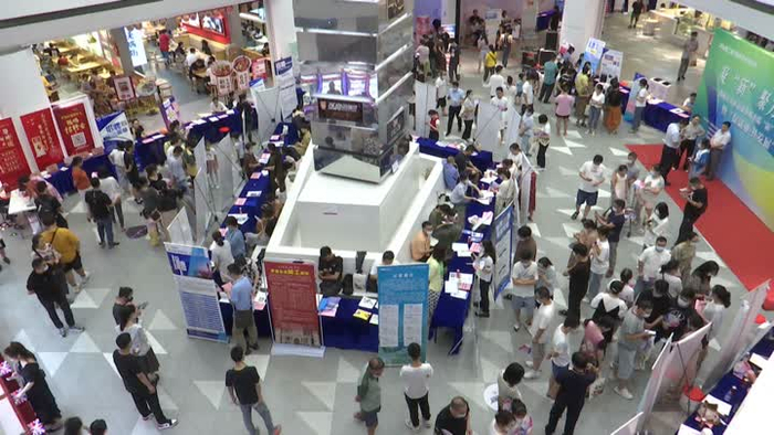 在永旺梦乐城地下一层的小吃街边上,52家企业提供了1000个岗位,涉及新能源,电子,医药,机械,纺织,电商直播等多个领域。这对应届毕业生来说,多了不少就业的选择。