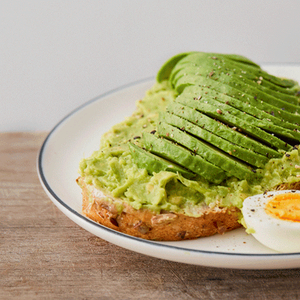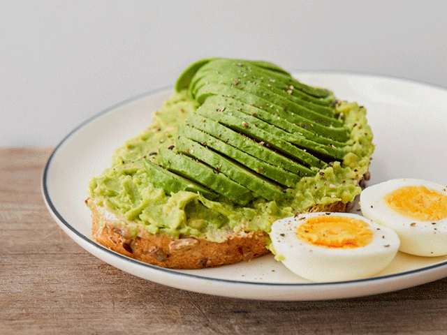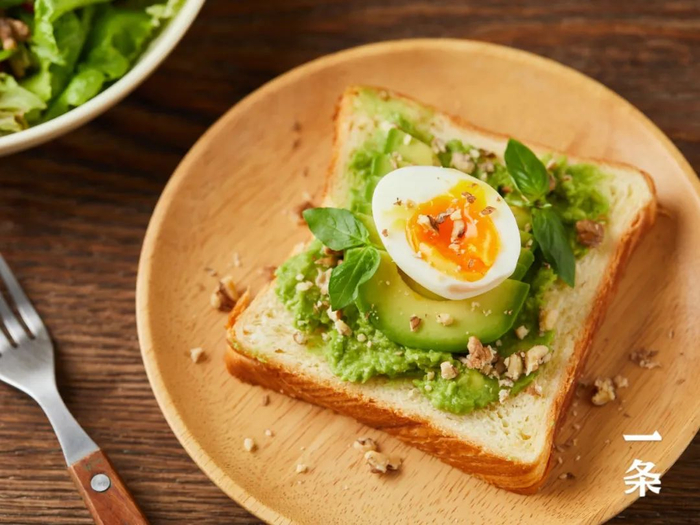 也可以将半个牛油果捣成泥,涂抹到面包片上,再将剩下半个牛油果切片放入。
