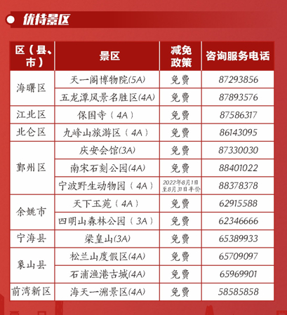 从2022年8月1日起,天一阁博物院(5A)、五龙潭风景名胜区(4A)、保国寺(4A)、九峰山旅游区(4A)、庆安会馆(3A)、马山休闲旅游区南宋石刻公园(4A)、天下玉苑(4A)、四明山森林公园(3A)、梁皇山(3A)、松兰山度假区(4A)、石浦渔港古城(4A)、海天一洲景区(4A)等12家公园、景区将为具有宁波市户籍且持有《中华人民共和国退役军人优待证》的退役军人提供“免费游览”的优待。