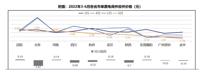 以申通为例,尽管6月有“618”大促,一定程度上拉高了价格,但6月份单票价格仍比1月份低了8分钱。