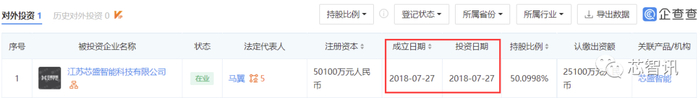 值得注意的是,深圳鸿泰基金管理的湖南芯盛对外投资企业也仅有一家,为江苏芯盛智能科技有限公司(以下简称“江苏芯盛”)。从江苏芯盛的股权结构来看,湖南芯盛为其第一大股东,持有其50.0998%的股权,而大基金则是其第二大股东,持股49.9002%。也就是说,江苏芯盛不仅获得了大基金子基金的投资,同时也获得了大基金的直接投资。