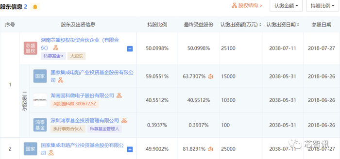 根据企查查资料显示,湖南芯盛成立于2018年6月26,出资额达2.54亿元,大基金为其第一大股东,持股比例63.7307%,湖南国科微电子股份有限公司(以下简称“国科微”)持股40.5512%,深圳鸿泰基金持股0.3937%。