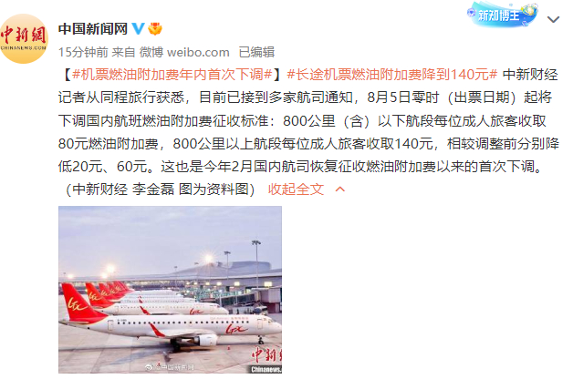 8月5日零时(出票日期)起将下调国内航班燃油附加费征收标准