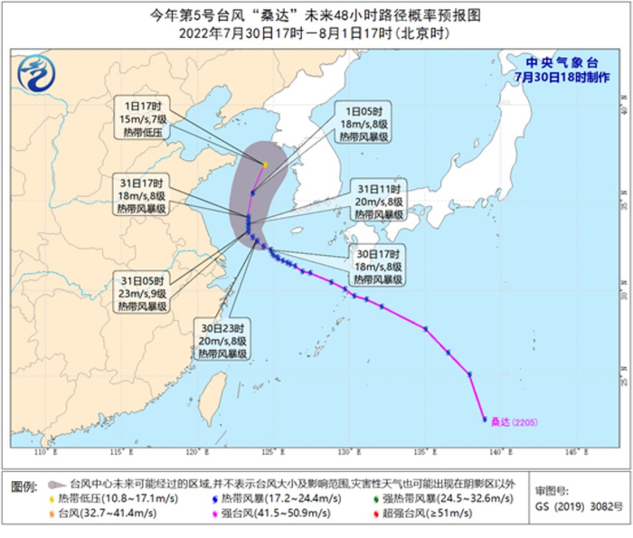 预计,“桑达”将以每小时15公里左右的速度向西北方向移动,将于31日在黄海南部转向偏北方向移动,强度变化不大,8月1日开始转向北偏东方向移动,强度逐渐减弱。