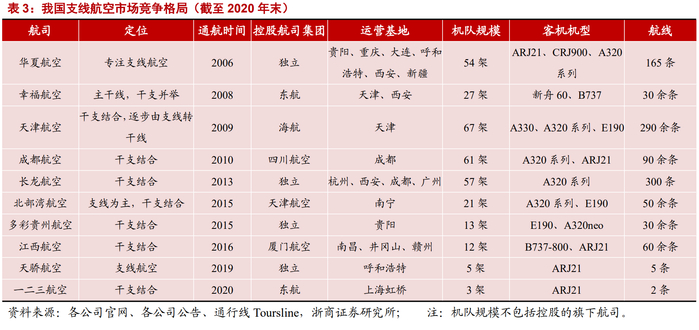 支线航司主要通过下沉三四线城市,覆盖区域性网络来提高市占率,其中,华夏航空占据较大市场份额。据浙商证券2021年3月15日的研报,截至2020年底,华夏航空开通航线165条,通航点124座,其中支线航线占比95%。