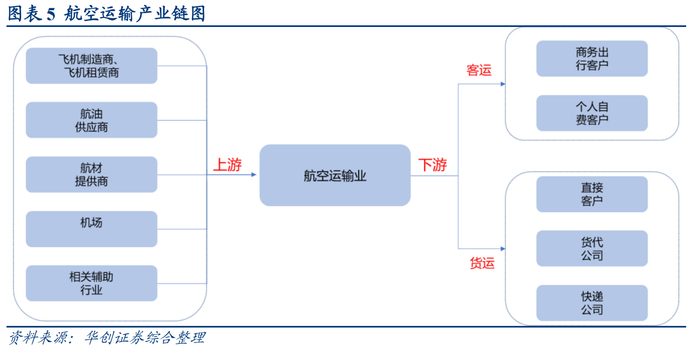 据华创证券研报,航空运输业上游主要包括飞机、航油、航材供应商、机场和相关辅助行业,下游主要业务包括客运客户和货运客户。