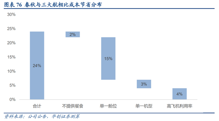 与三大航走差异化路线的春秋航空是低成本航司的代表,吴一凡等人分析其因“两单”、“两高”和“两低”的特点而更具有成本优势,即单一机型、单一舱位、高客座率、高飞机利用率、低销售费用与低管理费用,相比较传统全服务航司,其较低的总成本和变动成本降低了公司全成本的盈亏平衡点,运营韧性更强。