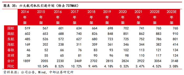 值得注意的是,魏大朋认为基数提升叠加疫情冲击,航司飞机引进计划确定性增速放缓。一方面,在2015~2018年期间,行业增速围绕10%波动,2019~2021年行业同比增速降至4.18%、0.32%和3.47%。另一方面,疫情对民航业造成了巨大冲击,航司普遍负债率高增,对未来需求的悲观预期使得中国航司飞机引进速度放缓。