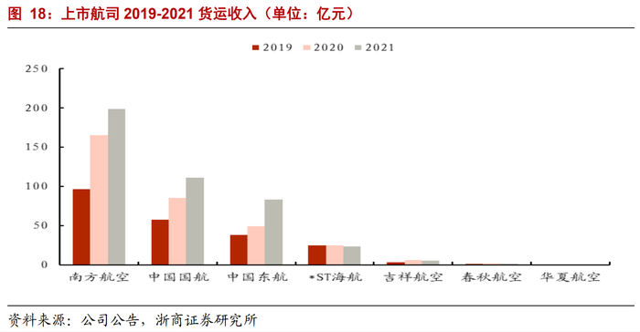 相对受疫情影响较大的客运业务,货运需求保持旺盛,据中邮证券分析师魏大朋分析,三大航通过运用货机或客改货的方式发力货运业务,货运业务近三年呈现上涨趋势,在货运收入的规模上保持领先优势,南航、东航、国航2021年货运收入同比2019年分别增长107%、117%、94%,收入占比不断提升。