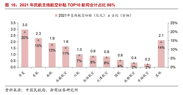 在2021年民航支线航空补贴预案中,共有58家航司获得14.9亿元补贴,其中华夏占比20%,排名第1,东航、南航排名第二与第三。
