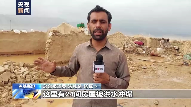 总台报道员 法扎勒·塔瓦卜:巴基斯坦俾路支省首府奎达周边地区都受灾严重。我现在在这个叫埃尔纳斯的村庄里,这里有24间房屋被洪水冲塌,房子里的财物也被水带走了,这里的人们面临非常困难的局面,他们很担心。目前救援正在进行中。
