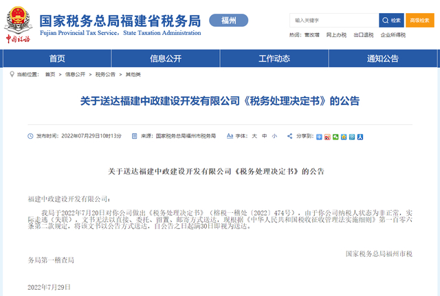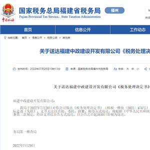 7月29日,国家税务总局福州市税务局官网发布关于送达福建中政建设开发有限公司《税务处理决定书》的公告。公告中指出,福建中政建设开发有限公司因取得2份虚开的增值税普通发票,价税金额合计618297元,被税务部门检查并要求按规定进行相关账务调整。