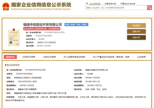 记者在国家企业信用信息公示系统查询了解到,福建中政建设开发有限公司成立于2004年11月8日,经营范围包括市政工程、房屋建筑工程、公路工程、园林建筑工程及城市道路照明工程、土石方工程、装饰装修工程的设计与施工。目前,该企业被列入市场监管部门经营异常名录。
