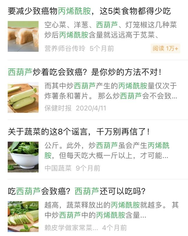 搜一下“西葫芦致癌”,会跳出来很多文章,它们都会提到其烹饪过程中极易产生一种致癌物质“丙烯酰胺”。