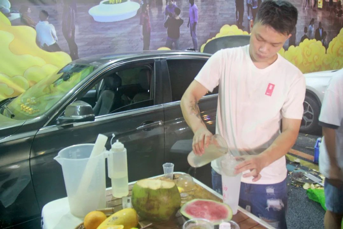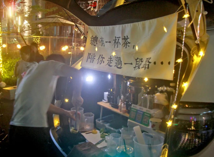 面对疫情之下的经济压力,“后备箱集市”也为一些人提供了一个兼职选择。阿成从事酒店娱乐行业,因疫情原因,生活压力比较大,便尝试着来这里摆摊兼职卖奶茶。