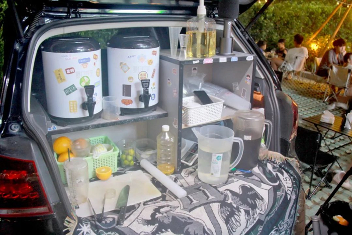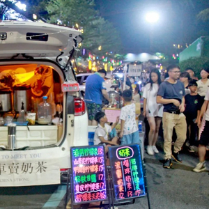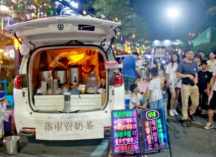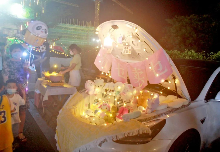 在销售中心一侧,只见几十辆私家车有序地停放在空地上,车主们各自把后备箱打开,然后缠一圈氛围灯,再挂起标新立异的摊位招牌,最后在车辆旁边支起几张折叠桌椅,一家家微型店铺就这样张罗出来了,一个流光溢彩的“后备箱集市”也就成形了……