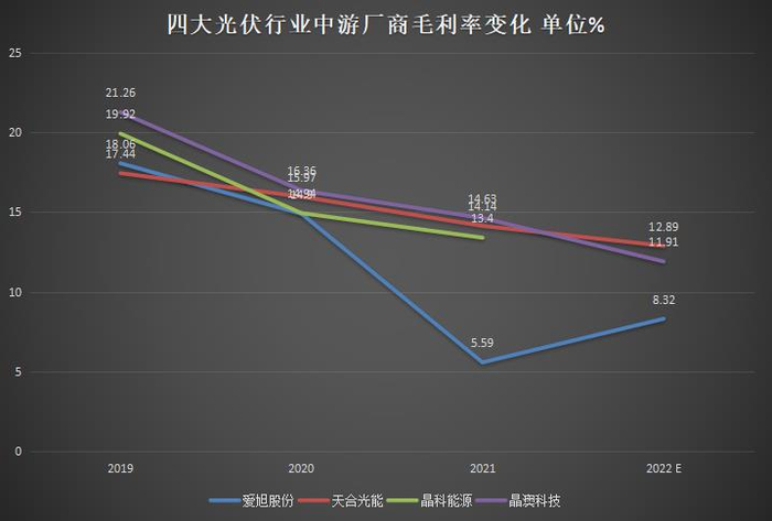 此外,爱旭股份、天合光能、晶科能源和晶澳科技从2019年开始不断下滑的毛利率,也说明行业成本传导不是那么顺畅。