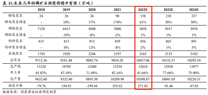 据段海峰测算,锂电对磷矿石需求增速最快,未来几年锂电、磷肥、饲料对磷矿石需求将稳中有涨,加上其它需求,预计今年磷矿石总需求突破10000万吨。