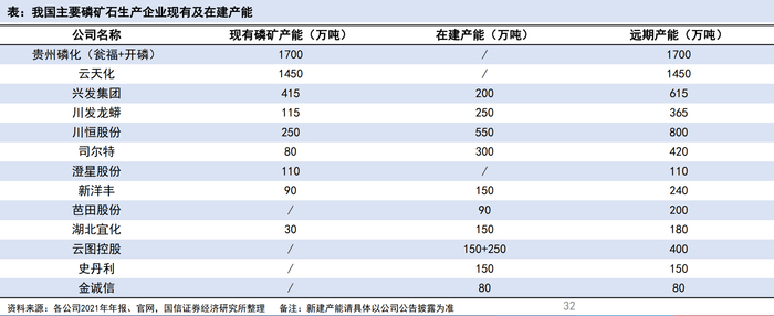 据国信证券研报统计,截至2021年,我国磷矿石储量约32亿吨,产量8500万吨,前十大磷矿石生产企业贡献近一半产量。上市公司中云天化、兴发集团、川恒股份、川发龙蟒、新洋丰、司尔特、湖北宜化等,2021年磷矿产能分别达到1450、415、250、115、90、80、30万吨,加上贵州磷化1700万吨产能,合计约4130万吨。
