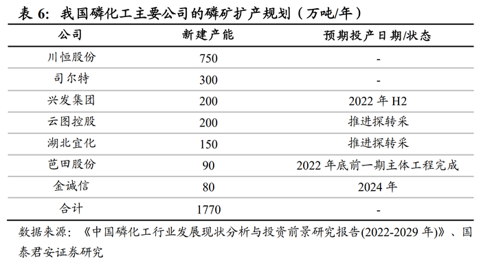 新增产能上,段海峰统计,目前国内磷化工主要公司的磷矿扩产规划达1770万吨/年,川恒股份、司尔特、兴发集团等公司均有磷矿扩产规划,但预计年内能投产仅兴发集团与芭田股份共计290万吨/年的产能。