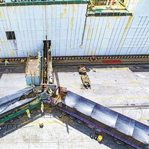 “为了疫情防控安全和提高活牛的接卸效率,我们提前在船舱与接驳车之间架设了空中过道,避免人货接触,让牛实现‘不落地’船车转运,同时提前敷设防滑材料,防止活牛在奔跑时滑倒。”镇海港区码头工人介绍。