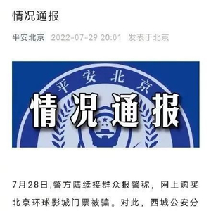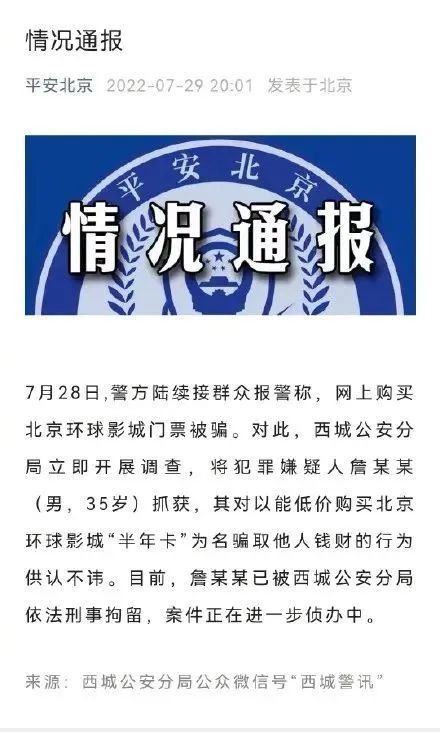 7月29日晚间,北京市公安局发布通报,警方陆续接群众报警称,网上购买北京环球影城门票被骗。对此,西城公安分局立即开展调查,将犯罪嫌疑人詹某某(男,35岁)抓获,其对以能低价购买北京环球影城“半年卡”为名骗取他人钱财的行为供认不讳。