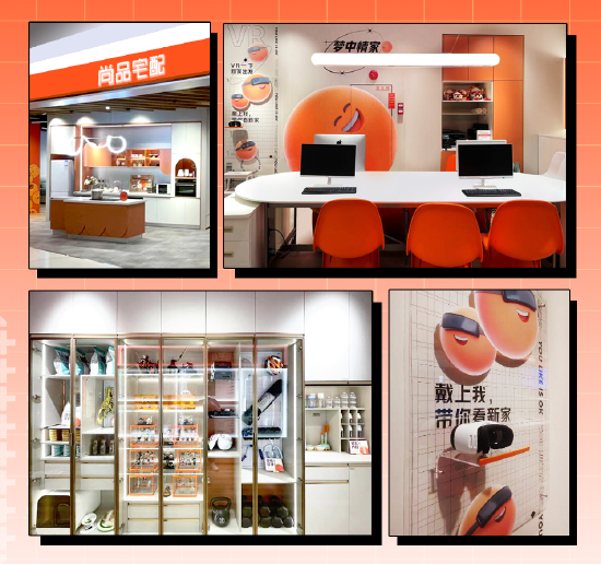 与以上业态类似但又有所升级,作为头部定制家居品牌企业的代表,尚品宅配近来因“小橙店”频频获得行业高度关注,笔者获悉,其店面聚焦85和90后等年轻消费群体,且主打小而全+场景化+个性定制等,以鲜艳亮眼的品牌主色调橙色系为主,结合时尚感、科技感十足的设计元素,远看吸睛进去后体验感十分强烈。