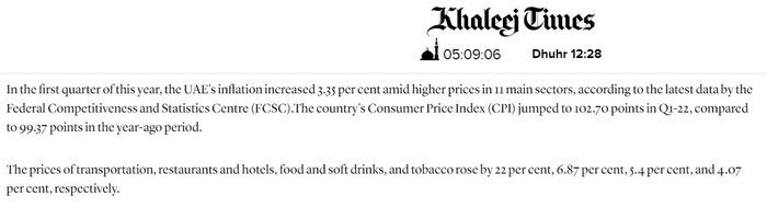 根据阿联酋联邦竞争力和统计中心最新数据,2022年第一季度阿联酋通货膨胀率升至3.35%。第一季度,该国消费者价格指数(CPI)升至102.7,去年同期为99.37。交通运输、饭店酒店、食品饮料的价格涨幅分别为22%、6.87%和5.4%。迪拜酋长国国民银行(ENBD)报告显示,预计今年阿联酋平均通胀率将从之前的2.3%上升到4.3%,消费者开始感受到通胀上升的压力。