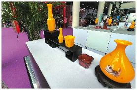 在琉璃展区,淄博康乾琉璃带来的鸡油黄、鸡肝石琉璃制品尽显高贵典雅。“鸡油黄”与“鸡肝石”是琉璃中著名的色料,鸡油黄琉璃烧制技艺几度失传,该项目传承人孙云毅系统改良了技术和配方,使其制作技艺得以保护、传承。淄博康乾琉璃经理丰婷婷称,孙云毅制造的复古琉璃鸡油黄光泽晶莹、温润凝重,其十余件作品被故宫博物院收藏,制作鸡油黄难度大,“十缸九不成”,精品极为难得。看到这些雅致、精美的琉璃作品,参观者无不赞叹。