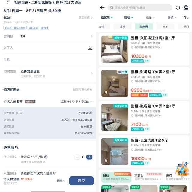 以陆家嘴为例,商城路站附近不少50平方米上下的两室一厅的整租价格在8000元以内,低于50平方米的一室一厅房租价格在6500元/月以内。而以同地段的首旅如家旗下和颐致尚上海陆家嘴东方明珠滨江大道店为例,8月1日至8月31日入住30晚的房间仅有35-40平米的套房,价格为12000元。