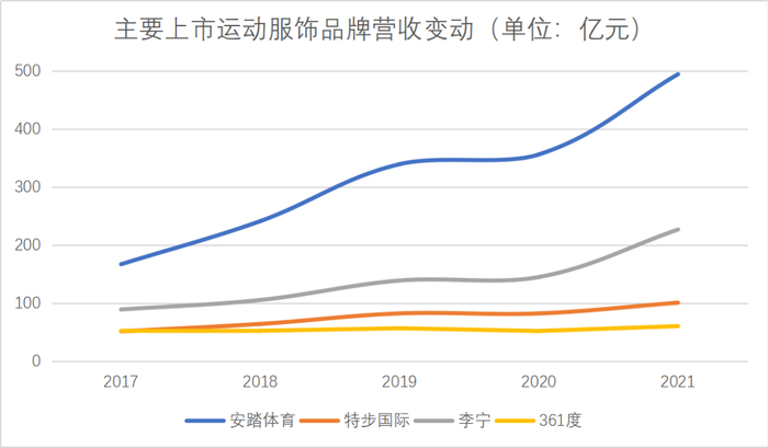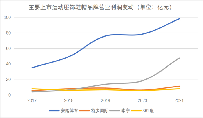 以表中数字计算,安踏5年间年复合增长率约为24.25%,李宁公司约为20.59%。2021年,安踏体育下仅“安踏”单个品牌的收入,就高于李宁公司的总收入。