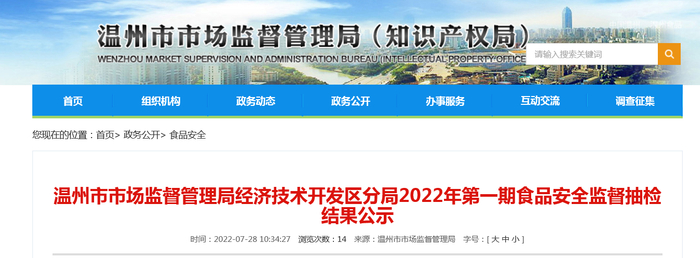 中国质量新闻网讯 7月28日,浙江省温州市市场监督管理局网站公布一条抽检信息,涉及温州市市场监督管理局经济技术开发区分局2022年第一期食品安全监督抽检结果公示。