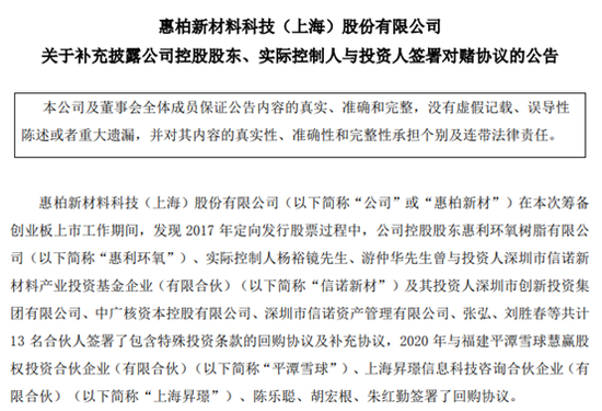 虽然该对赌协议因为“卡点”申报已经解除,但如果惠柏新材上市申请被否决或撤回上市申报材料,则该等协议及相关条款的效力自行恢复。