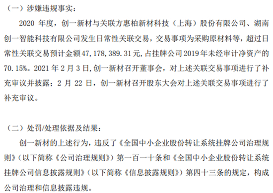 2021年9月,全国股转公司对创一新材及相关责任主体采取自律监管措施。违规的事项类别为公司治理和信息披露违规。具体来看,2020年度,创一新材与关联方惠柏新材、湖南创一智能科技有限公司发生日常性关联交易,交易事项为采购原材料等,超过日常性关联交易预计金额4717.84万元,占挂牌创一新材2019年未经审计净资产的70.15%。2021年2月3日,创一新材召开董事会,对上述关联交易事项进行了补充审议并披露;2021年2月22日,创一新材召开股东大会对上述关联交易事项进行了补充审议。