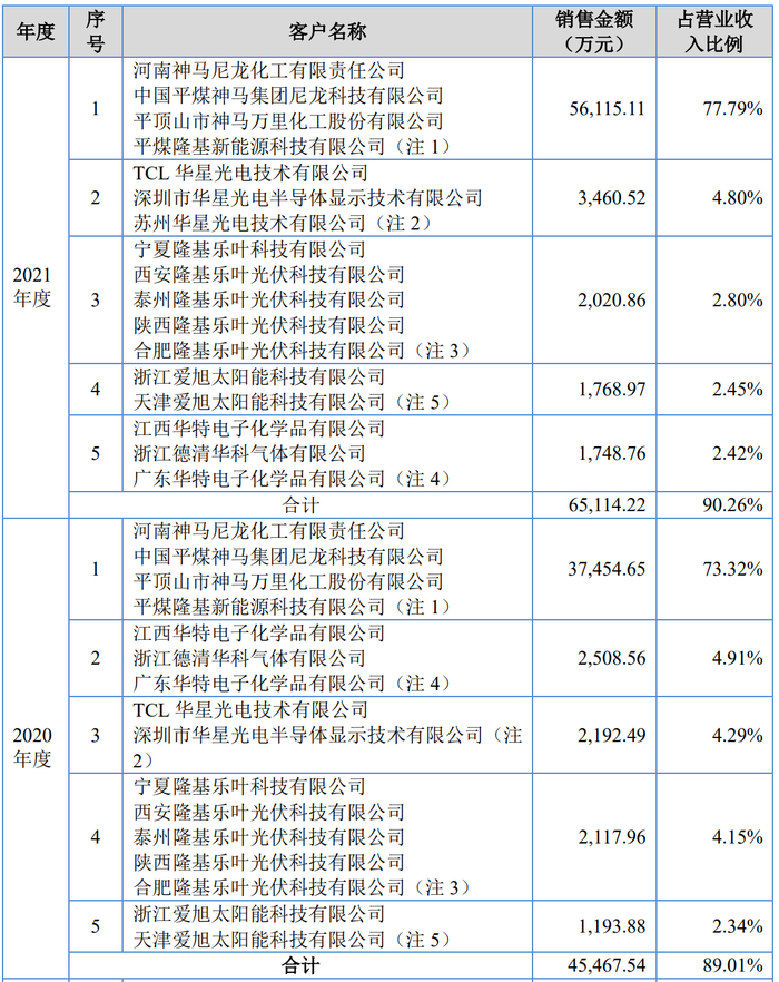 硅烷科技的核心客户主要集中在光伏、显示面板以及半导体领域。公司招股书显示,2021年公司的前五大客户分别是河南神马尼龙化工有限责任公司、TCL华星光电技术有限公司、宁夏隆基乐叶科技有限公司、浙江爱旭太阳能科技有限公司、江西华特电子化学品有限公司。公司通过外购原材料和处理煤化工企业的尾气,经化学或物理反应生产硅烷、氢气产品,以瓶装、管束车或管道等方式向客户供应。