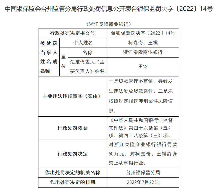 根据《中华人民共和国银行业监督管理法》第四十六条第(五)项、第四十八条第(三)项,对浙江泰隆商业银行银行罚款50万元,台州银保监分局对柯嘉奇、王祺终身禁止从事银行业。